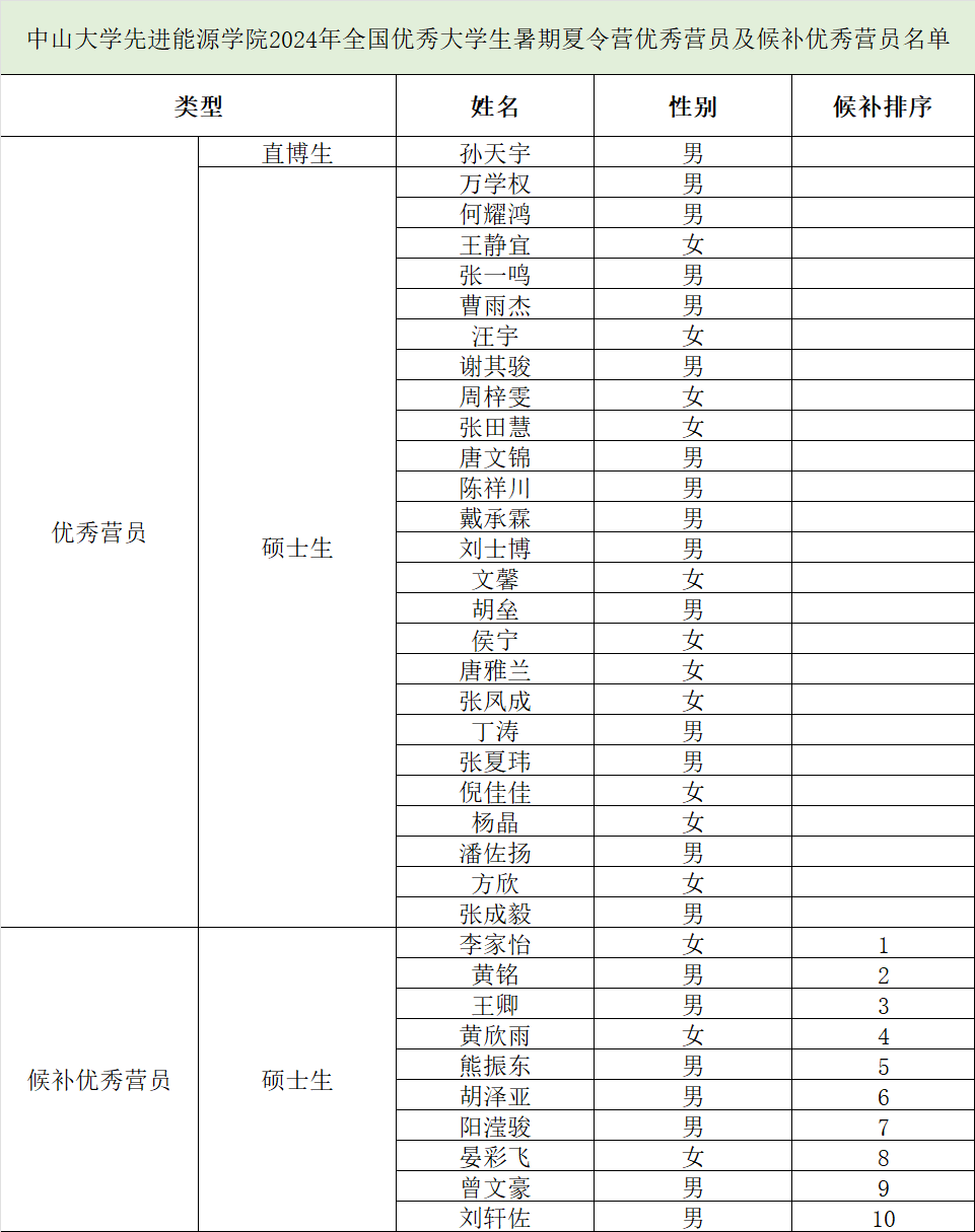 【硕博】关于公布中山大学先进能源学院2024年全国优秀大学生夏令营优秀营员名单的通知