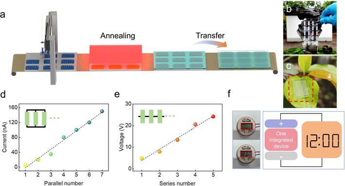 图2(a)图案化水伏器件大规模制造示意图;(b)大规模可集成图案化ZnO阵列;(c)单个图案化氧化锌ZnO水伏器件;(d)多个图案化ZnO水伏器件并联输出电流变化规律;(e)多个图案化ZnO水伏器件串联输出电压变化规律;(f)一个集成系统驱动电子手表示意图。