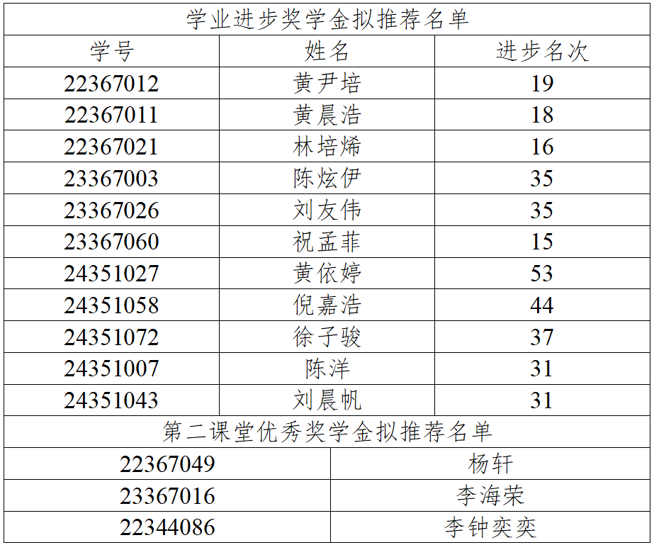 根据《党委学生工作部关于开展2024—2025学年本科生奖学金评选工作的通知》,按照全国学生资助管理中心的工作要求,结合我院实际,根据《中山大学本科生奖学金管理办法》(中大学生〔2023〕9号),《先进能源学院关于评选2024-2025学年中山大学专项奖学金的通知》,经个人申请、学院审核,拟推荐黄尹培等11人获学业进步奖学金,拟推荐李钟奕奕等3人获第二课堂优秀奖学金,现将具体名单予以公示。